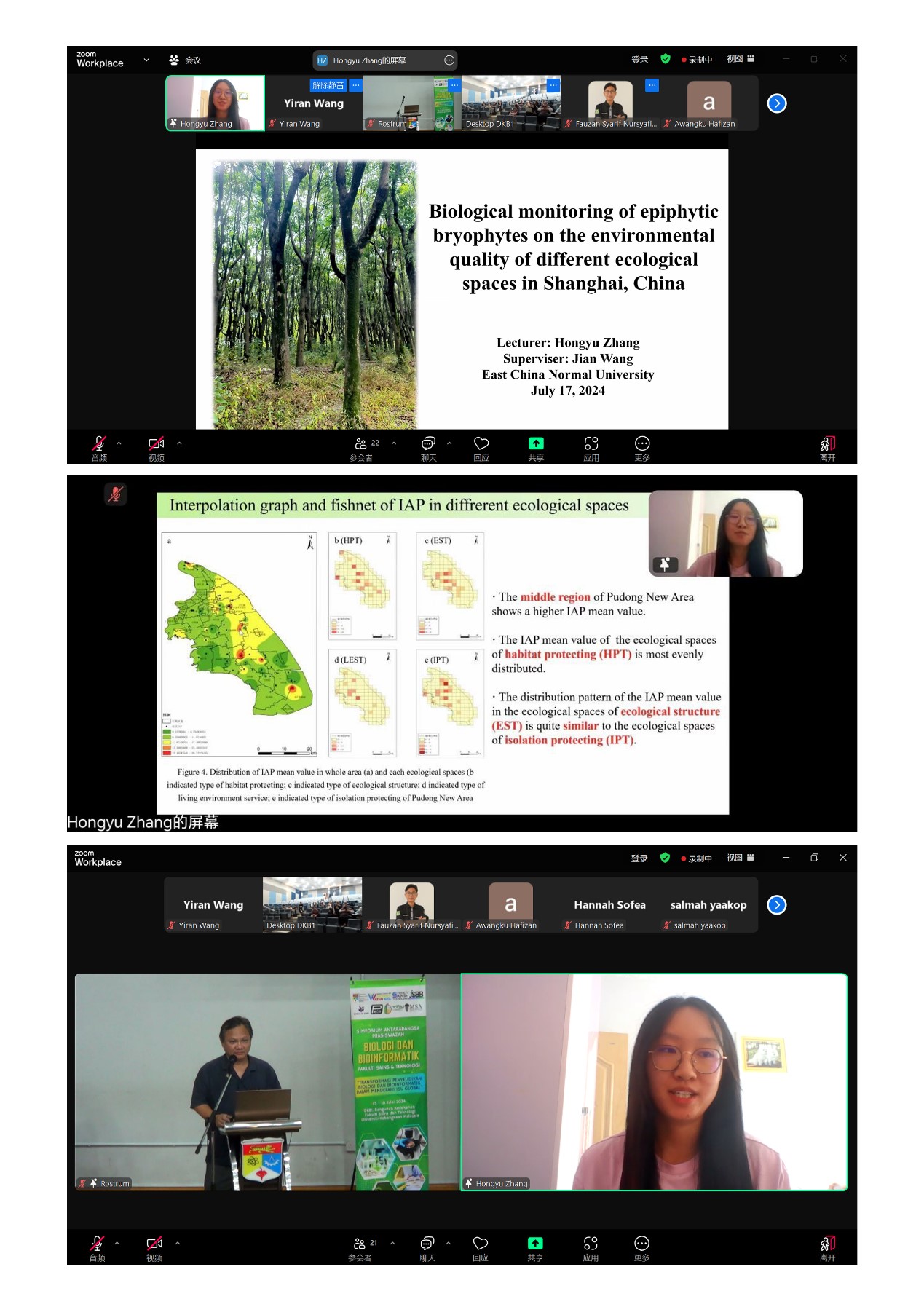 本次研讨会的宗旨在于为在校的本科生提供一个分享和展示他们最新科研成果的机会,并加强本地高等院校和国际院校大学生之间的联系,激发并展开新的合作。本次会议共有77位报告人,其中有49位同学来自生物专业和19名来自生物信息专业。张虹宇同学作为本次会议7位受邀的国际同学之一,在7月17日下午做了题为“Biological monitoring of epiphytic bryophytes on the environmental quality of different ecological spaces in Shanghai, China”的特邀报告。该报告以上海市浦东新区为例,通过对151个位点的树附生苔藓植物的调查,探究了基于树附生苔藓植物丰富度、盖度和频度的大气净度指数法(the Index of Atmospheric Purity, IAP)对城市不同生态空间的指示作用。研究指出了城市化进程中的“近自然林”建设对树附生苔藓植物多样性保护的关键作用,同时揭示了大气净度指数可作为生态空间类型的划分依据之一,在城市生态环境质量及生物多样性的监测和指示中发挥着重要的作用。与会专家和同学对该报告的内容表现出了强烈的兴趣,并与张虹宇同学展开了热烈的讨论。