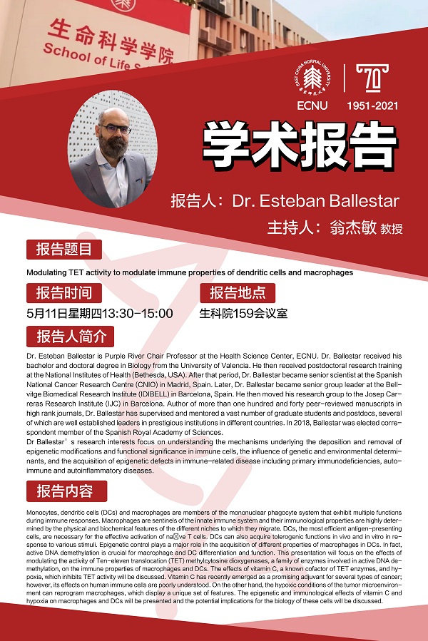 报告题目:Modulating TET activity to modulate immune properties of dendritic cells and macrophages